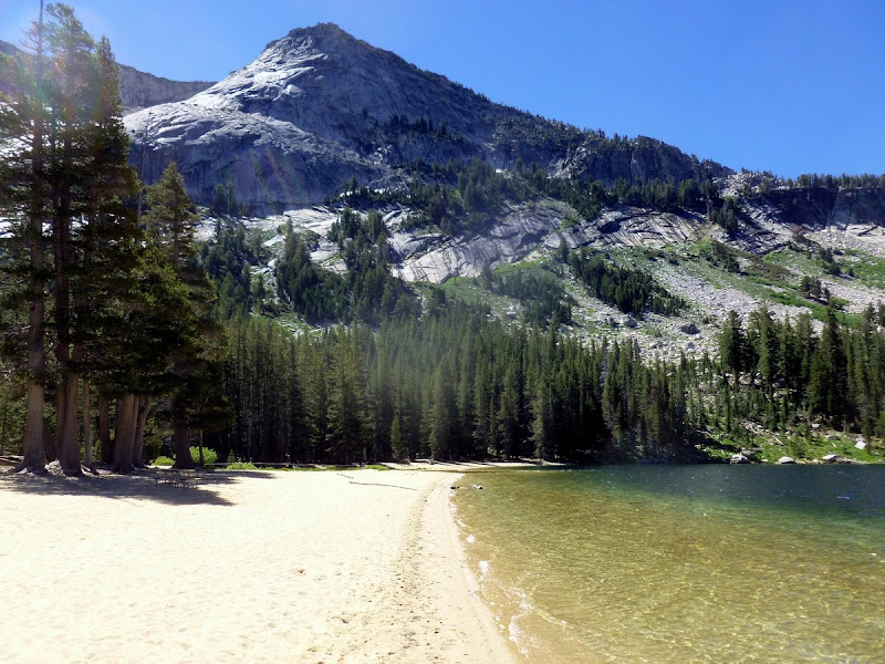 The cross-country terrain turned out to be a piece of cake, and we were rewarded with the double bonus of a small stream for re-filling our water bottles (we each went through 2-3 litres on the climb) and a fantastic close-up view into the heart of the Cathedral Range from the top of the saddle. Next time it would be fun to add a quick scramble to the top of Tresidder’s south peak or the Columbia Finger (both are just a pitch or two of low 5th class climbing). Just as Beth was beginning to question my route finding ability, we intersected the JMT, exactly where I had intended. Never doubt an Eagle Scout with a map and compass!
